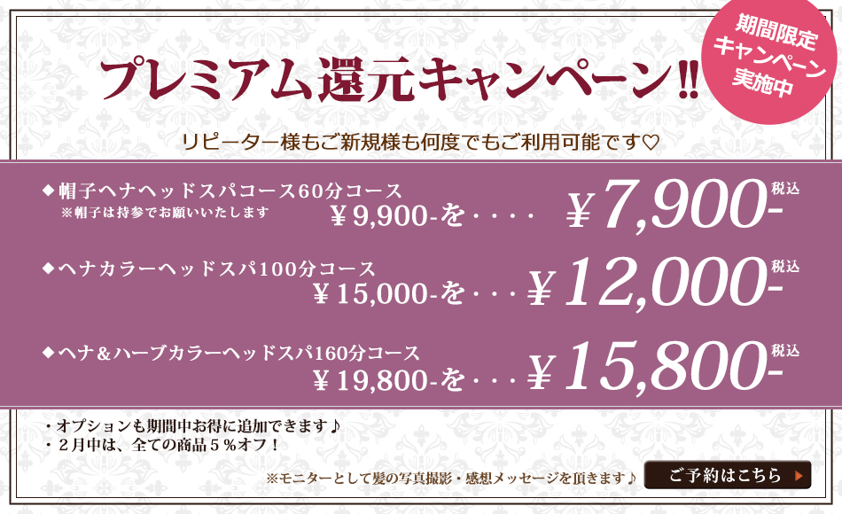 完全個室のプライベート空間でリラックスして頂き、オーガニックハーブの中でも最高品質AAAランクヘナを使い横になったままヘッドスパやアロママッサージができるナチュラルヘッドスパです。ヘナは、アーユルヴェーダ伝承医学で5000年も前から愛されている薬草です。